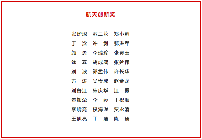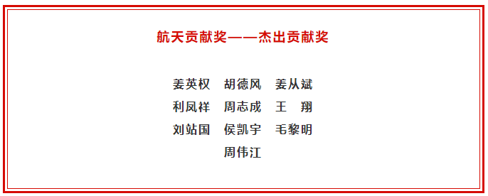 姜英權(quán)、胡德風(fēng)、姜從斌、利鳳祥、周志成、王翔、劉站國(guó)、侯凱宇、毛黎明、周偉江等10人獲得“2021年度航天貢獻(xiàn)獎(jiǎng)——杰出貢獻(xiàn)獎(jiǎng)”榮譽(yù)稱號(hào),每人獎(jiǎng)勵(lì)100萬(wàn)元。