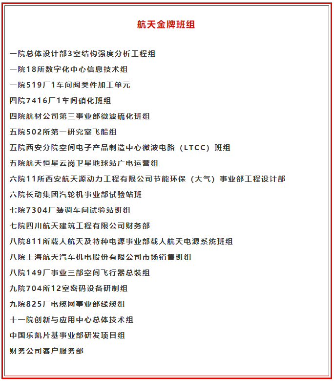 一院總體設(shè)計(jì)部3室結(jié)構(gòu)強(qiáng)度分析工程組等20個(gè)班組被授為“2021年度航天金牌班組”,每個(gè)班組獎(jiǎng)勵(lì)30萬(wàn)元。