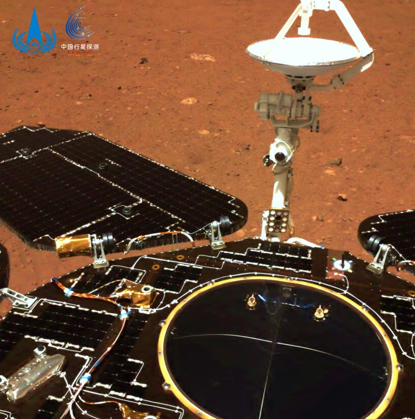 祝融號火星車也從火星表面?zhèn)骰刈耘恼?,相比剛剛著陸時拍的照片,可以看出火星車表面已積累了一層薄薄的沙塵。同時,通過火星車的遙測信息判斷,太陽翼的發(fā)電效率受到一定影響,但能源仍然充足。為了應(yīng)對沙塵覆蓋,火星車太陽翼進(jìn)行了特殊設(shè)計,可采取多種措施應(yīng)對沙塵引起的發(fā)電效率下降問題,目前尚無需使用,當(dāng)前能源狀態(tài)足以支持火星車?yán)^續(xù)行駛并開展探測。
