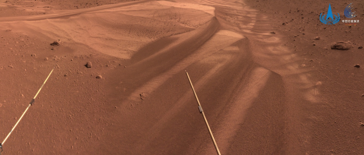 圖為祝融號火星車進入冬季休眠狀態(tài)前拍攝的巡視區(qū)影像。圖片來源:國家天文臺
