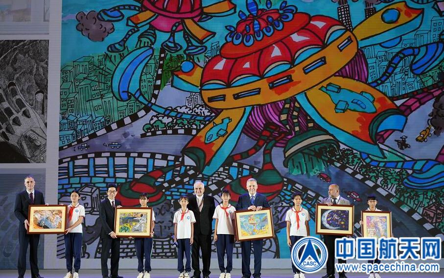 大會開幕式上舉行了“我的太空夢”航天主題繪畫贈禮。來自海南省文昌市龍樓鎮(zhèn)航天小學(xué)的小朋友們展示了精心創(chuàng)作的繪畫作品,分享了背后的創(chuàng)作故事,并向外賓贈送作品。