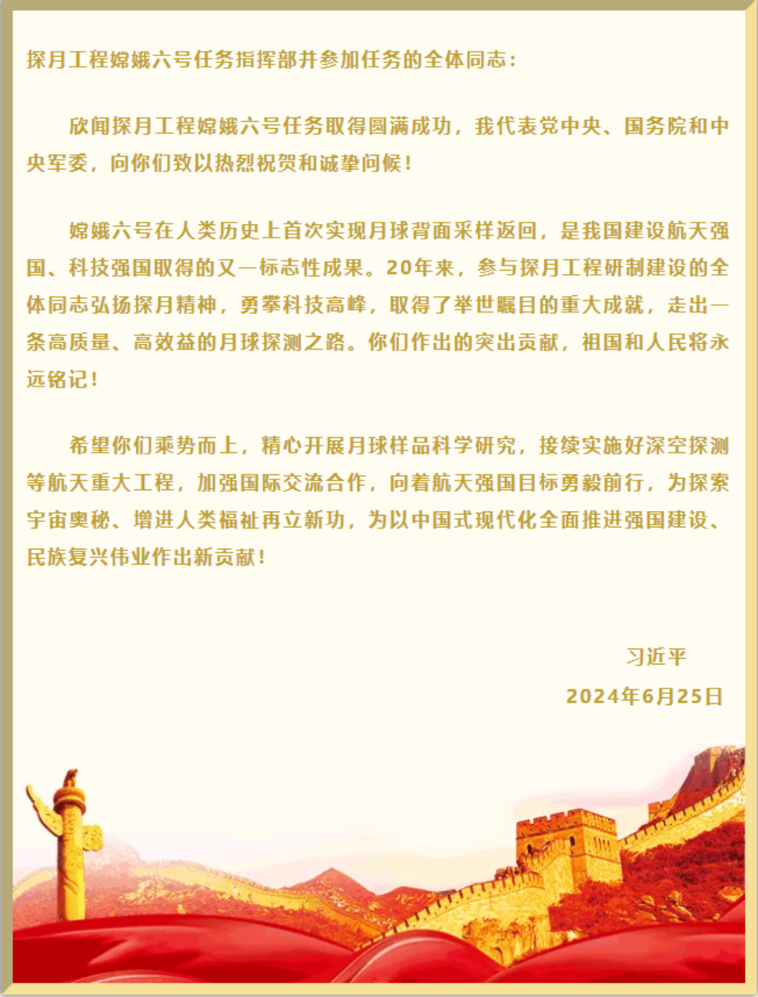6月25日14時(shí)07分,嫦娥六號(hào)返回器攜帶來自月背的月球樣品安全著陸在內(nèi)蒙古四子王旗預(yù)定區(qū)域。中共中央總書記、國(guó)家主席、中央軍委主席習(xí)近平發(fā)來賀電,代表黨中央、國(guó)務(wù)院和中央軍委,向探月工程嫦娥六號(hào)任務(wù)指揮部并參加任務(wù)的全體同志致以熱烈祝賀和誠(chéng)摯問候。