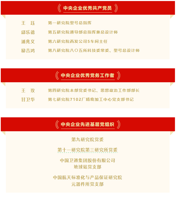 “七一”來臨之際,6月27日,國務(wù)院國資委黨委召開中央企業(yè)“兩優(yōu)一先”表彰大會(huì),隆重表彰中央企業(yè)優(yōu)秀共產(chǎn)黨員、優(yōu)秀黨務(wù)工作者和先進(jìn)基層黨組織。中國航天科技集團(tuán)有限公司4名共產(chǎn)黨員榮獲“中央企業(yè)優(yōu)秀共產(chǎn)黨員”稱號(hào),2名黨務(wù)工作者榮獲“中央企業(yè)優(yōu)秀黨務(wù)工作者”稱號(hào),4個(gè)基層黨組織榮獲“中央企業(yè)先進(jìn)基層黨組織”稱號(hào)。