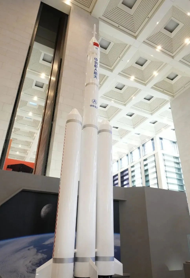 在“逐夢寰宇問蒼穹——中國載人航天工程三十年成就展”上展出的長征十號運(yùn)載火箭模型(宿東 攝)