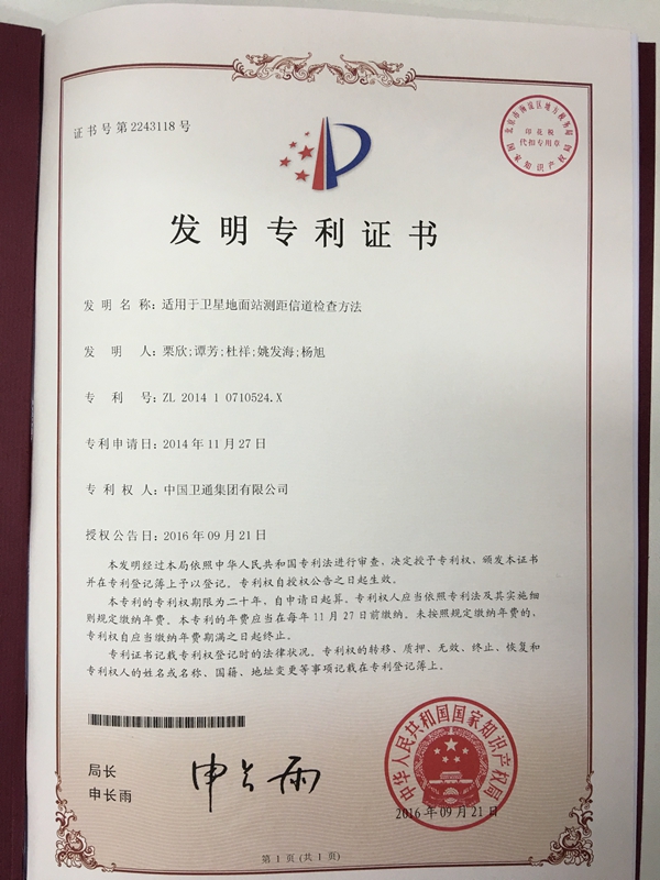 中國衛(wèi)通首個(gè)專利于2016年9月21日獲得國家知識產(chǎn)權(quán)局授權(quán)。該專利名稱為《適用于衛(wèi)星地面站測距信道檢查方法》,是一項(xiàng)發(fā)明專利,專利號:ZL 2014 1 0710524.X。這項(xiàng)專利是在開展集團(tuán)科技創(chuàng)新項(xiàng)目《靜止軌道衛(wèi)星多星統(tǒng)一測控管理系統(tǒng)研究與實(shí)驗(yàn)系統(tǒng)研制》的研究工作過程中完成的,也是課題成果之一。此專利核心技術(shù)是發(fā)明一種計(jì)算算法,可以實(shí)現(xiàn)對衛(wèi)星測控地面站測距鏈路上的設(shè)備可用性和連通性進(jìn)行檢查計(jì)算,既可用于檢查當(dāng)前測距路徑是否正確,也可用于查找可用測距路徑,對未來提高衛(wèi)星測控操作效率有重要意義。