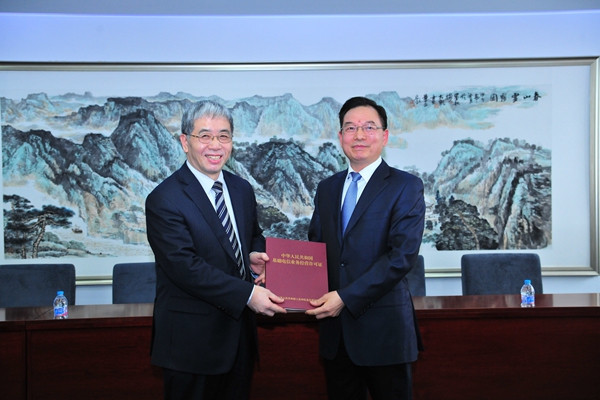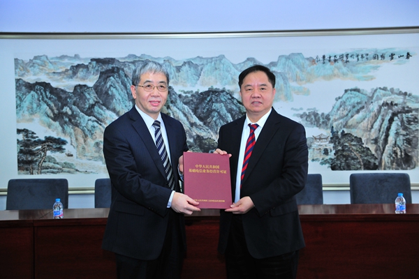工信部副部長陳肇雄向航天科技集團黨組書記、董事長雷凡培頒發(fā)許可證
