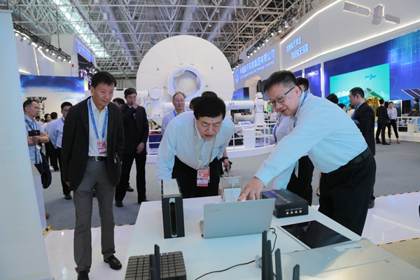 中國衛(wèi)通董事長李忠寶為航天科技集團副總經(jīng)理楊保華介紹展示內容