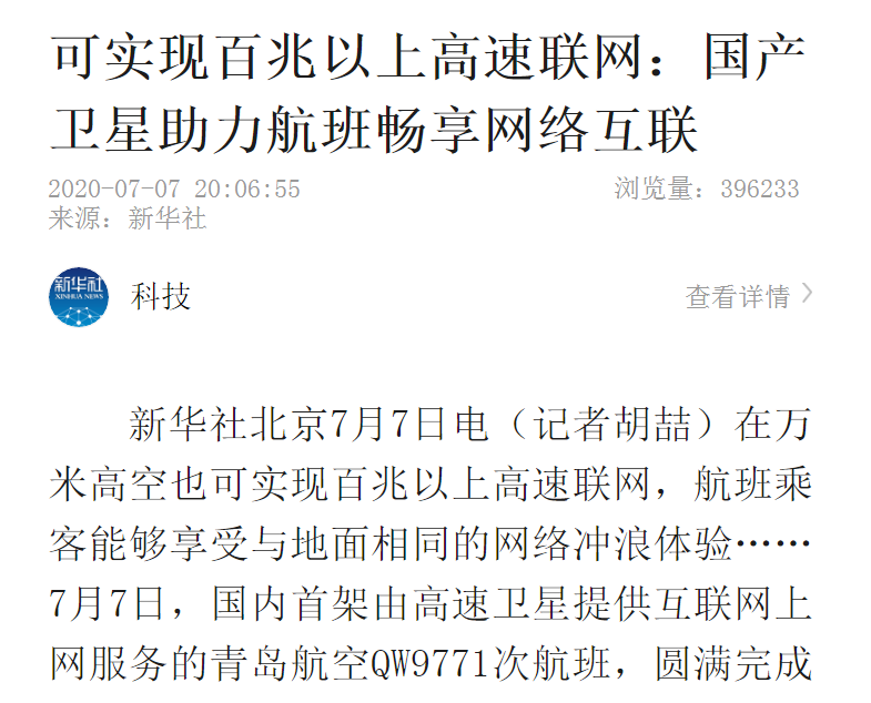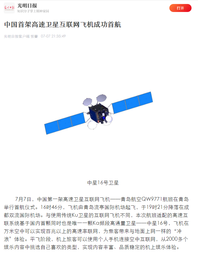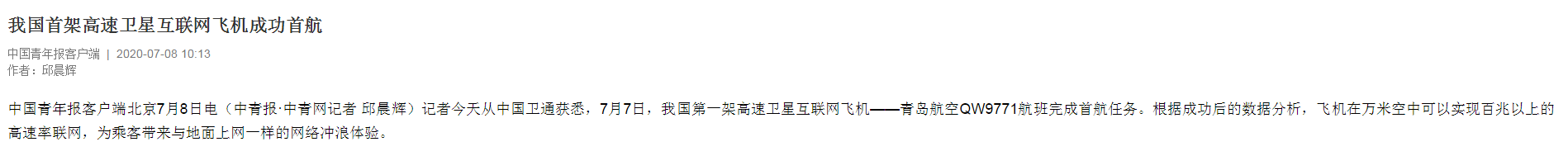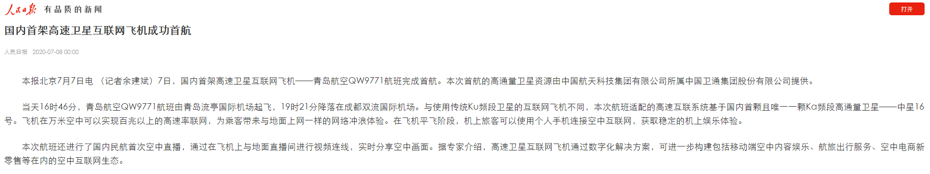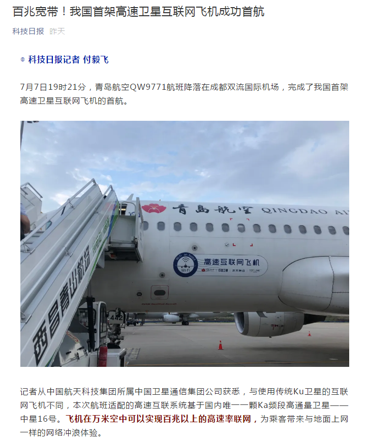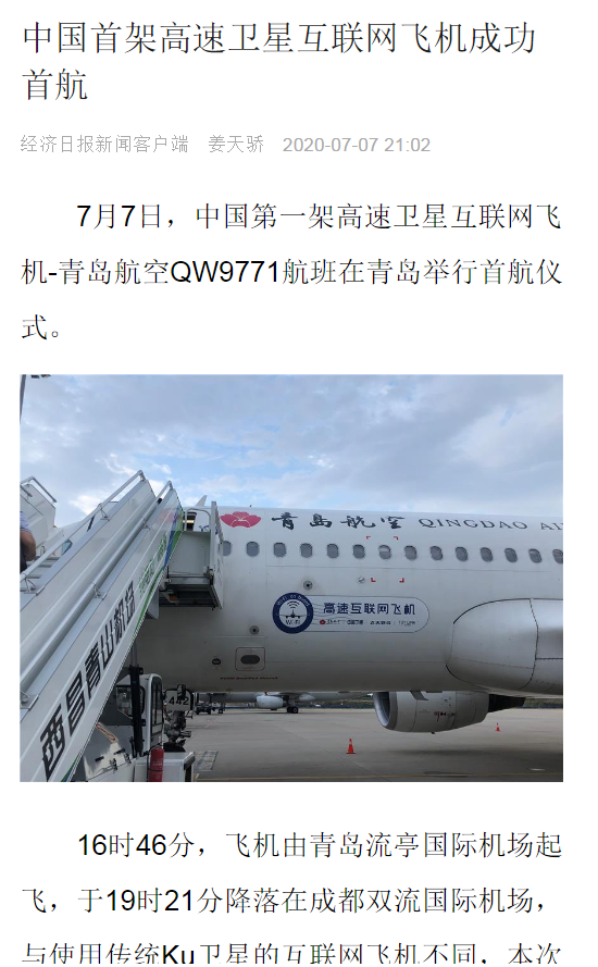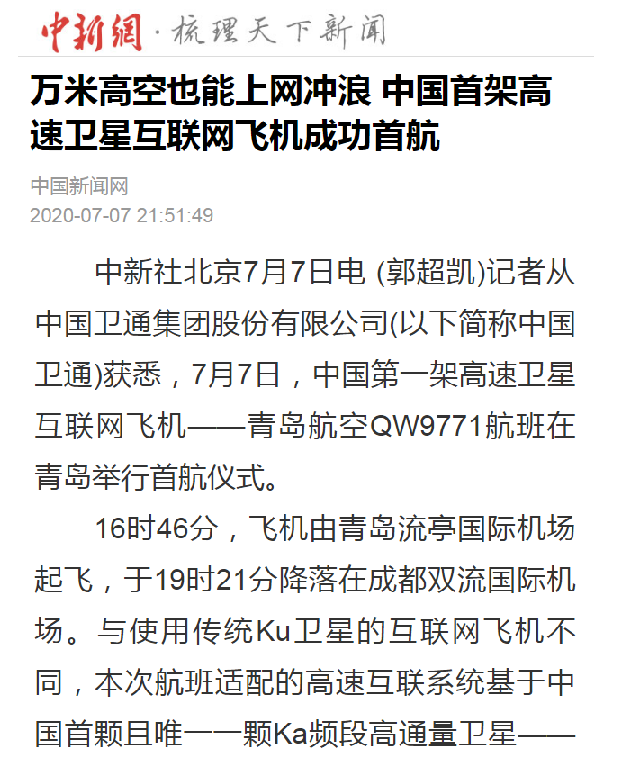 7月7日,國內(nèi)首架高速衛(wèi)星互聯(lián)網(wǎng)飛機——青島航空QW9771航班完成首航。本次首航的高通量衛(wèi)星資源由中國衛(wèi)通集團股份有限公司提供。