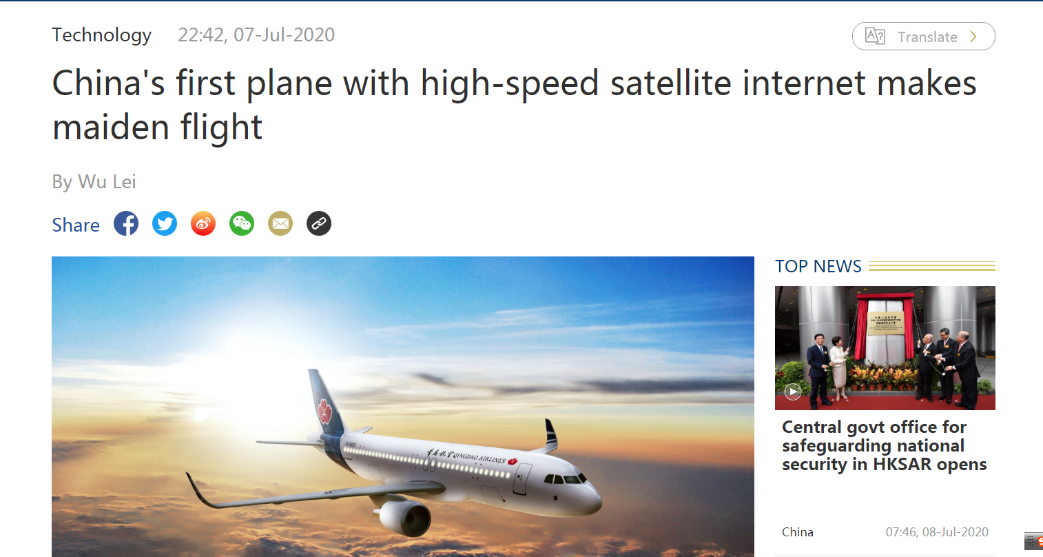 消息受到各大媒體關(guān)注,人民日報、新華社、光明日報、經(jīng)濟日報、央廣、國際臺、中國日報、科技日報、中國青年報、中新社等多家中央主要媒體,第一時間對中國首架Ka高速衛(wèi)星互聯(lián)網(wǎng)飛機成功首航進行了報道,對中國衛(wèi)通的品牌形象和業(yè)務能力進行了宣傳。