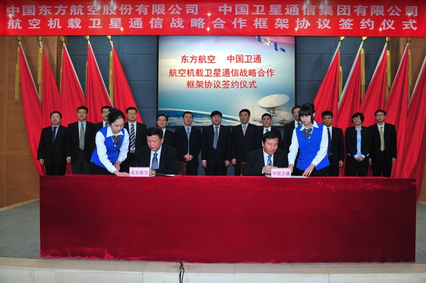 3月15日,中國衛(wèi)通和中國東方航空股份有限公司(以下簡稱東航股份公司)在北京簽署了關(guān)于雙方在國內(nèi)聯(lián)合開展航空器客艙衛(wèi)星寬帶通信業(yè)務(wù)的戰(zhàn)略合作協(xié)議。