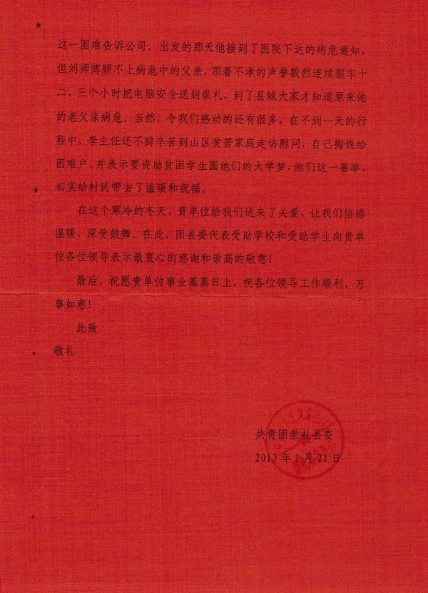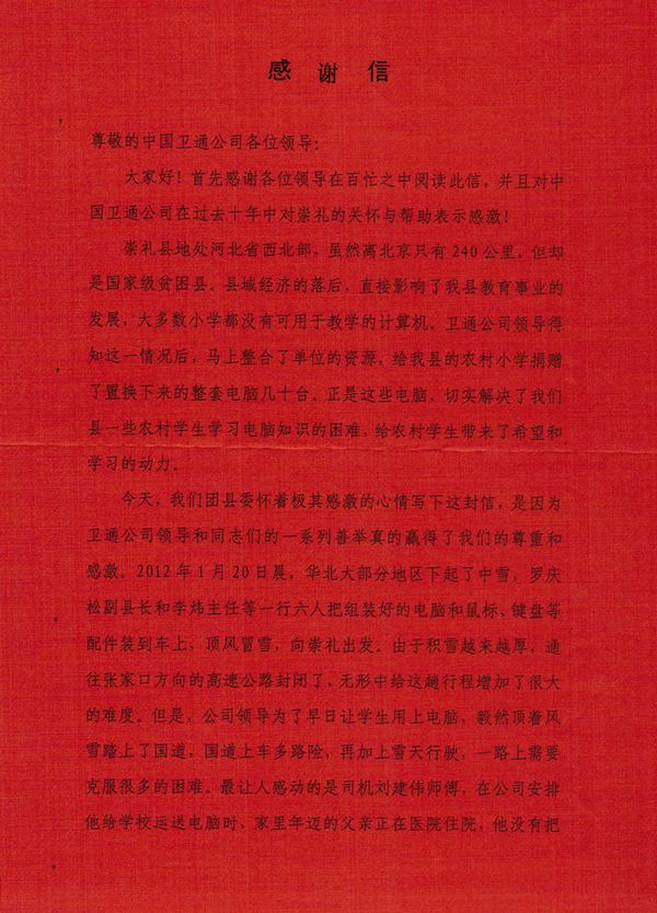 2月4日,共青團(tuán)崇禮縣委向中國衛(wèi)通發(fā)來一封感謝信,代表崇禮縣貧困山區(qū)學(xué)校和貧困學(xué)生對中國衛(wèi)通扶貧捐贈活動表達(dá)了衷心的感謝和崇高的敬意,語言質(zhì)樸卻情真意切。