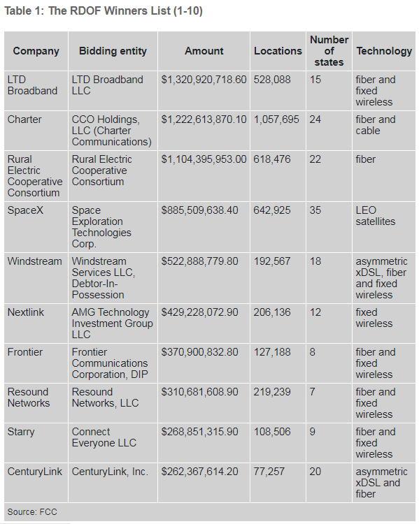 FCC在其“農(nóng)村數(shù)字化機會基金”(Rural Digital Opportunity Fund)的第一階段拍賣中表示,Charter Communications公司贏得了12.2億美元,將為106萬個地點提供服務,而SpaceX公司則贏得了8.85億美元,將為64.2萬個地點提供服務。此外,農(nóng)村電力合作聯(lián)社(Rural Electric Cooperative Consortium)贏得了11億美元,將為61.8萬個地點提供服務,LTD Broadband公司則贏得了13.2億美元,將為52.8萬個地點提供服務。